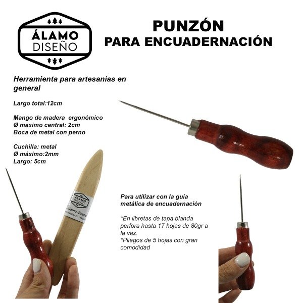 Punzón/ lezna: de mango largo y resistente para la comodidad del encuadernador ,se utiliza tanto para perforar hojas como para cuero de distintos espesores.